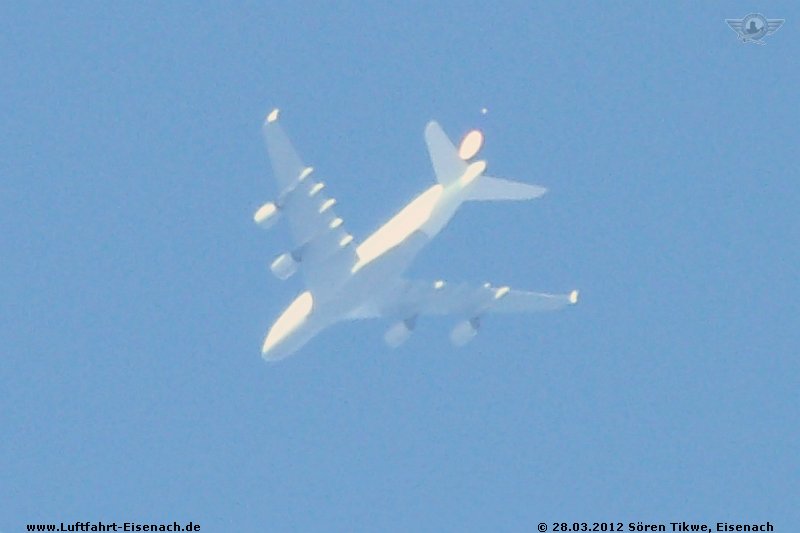 Recht tief flog am Mittwoch (28.03.2012) der Airbus A380-800 der Lufthansa mit dem Kennzeichen D-AIMC über die Wartburgstadt auf ihrem Weg von Frankfurt/Main nach Peking. Leider reichte es aufgrund der Überraschung nur für einen Notschuss.