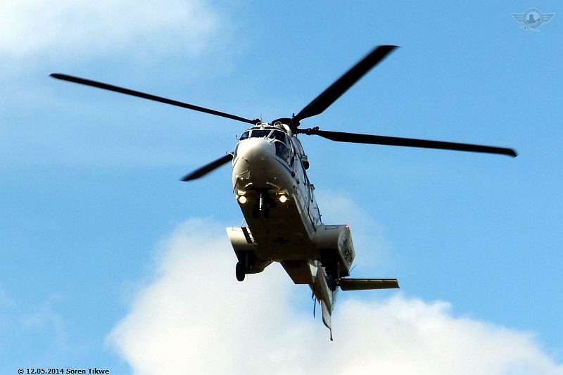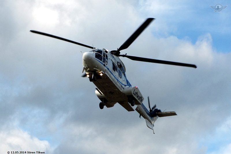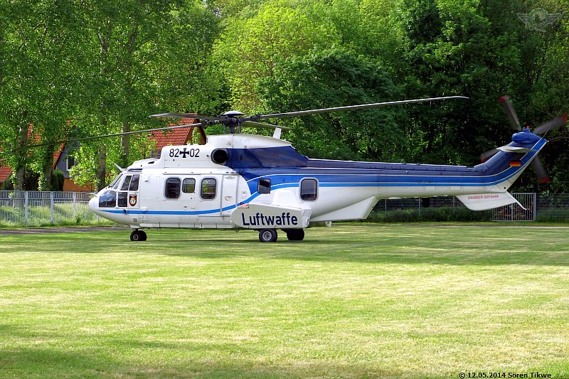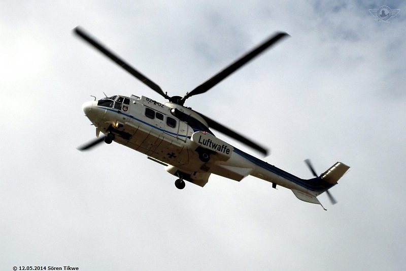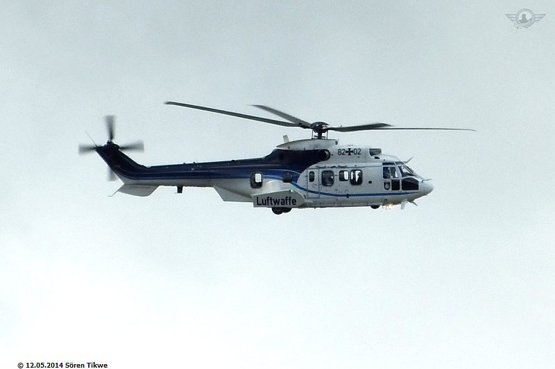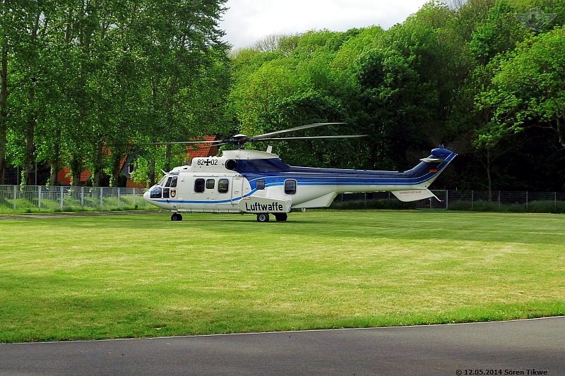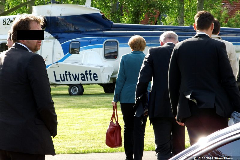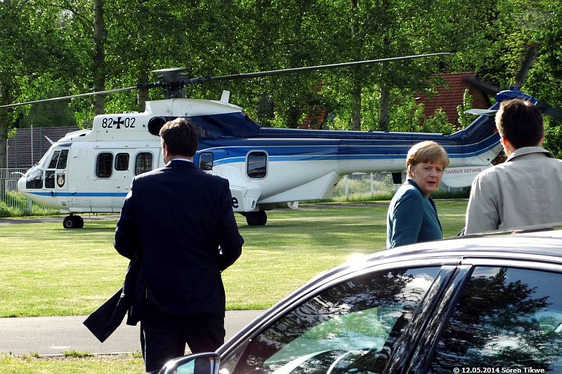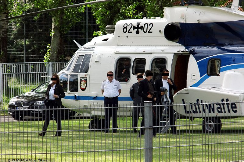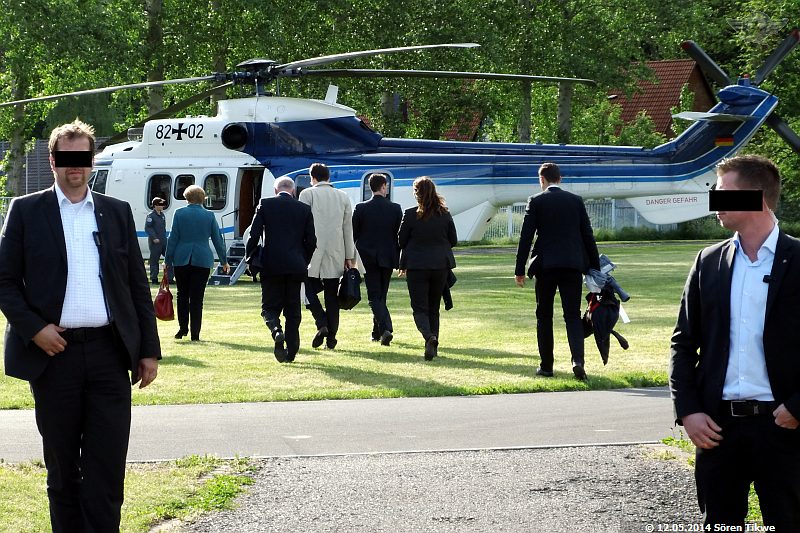 Am Sportplatz selbst standen nur 2 Polizeiwagen, also relativ wenig Polizeipräsenz verglichen mit den Maßnahmen, die man am Redeort, dem Eisenacher Marktplatz, ergriff. Gegen 16:45 Uhr war dann der Eurocopter Super-Puma AS-332 der Bundeswehr-Flugbereitschaft mit dem militärischen Kennzeichen 82+02 beim Einschweben.