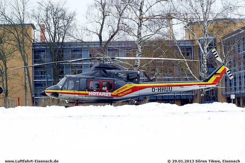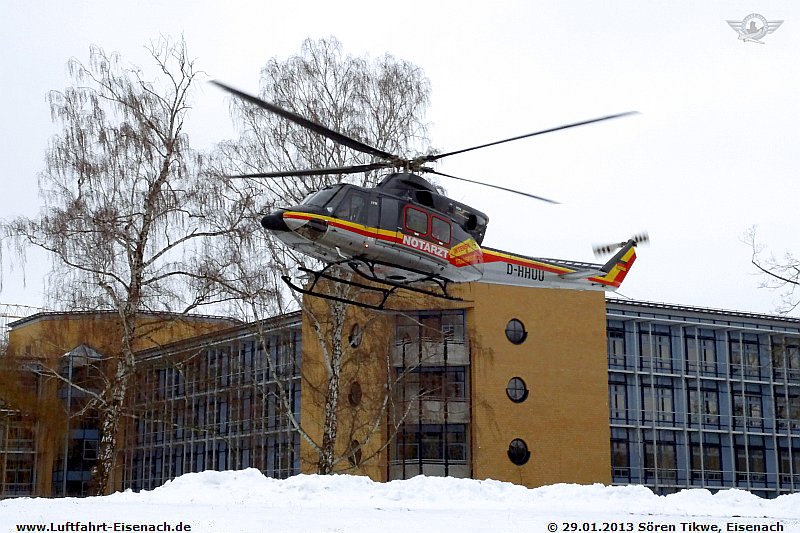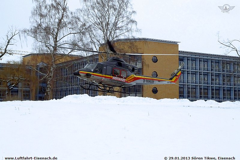 HDM-Luftrettung/DRF-Luftrettung war mit dem ITH Bell 412 HP mit dem Kennzeichen D-HHUU wegen einer Patierntenverlegung am Eiseancher Krankenhaus.