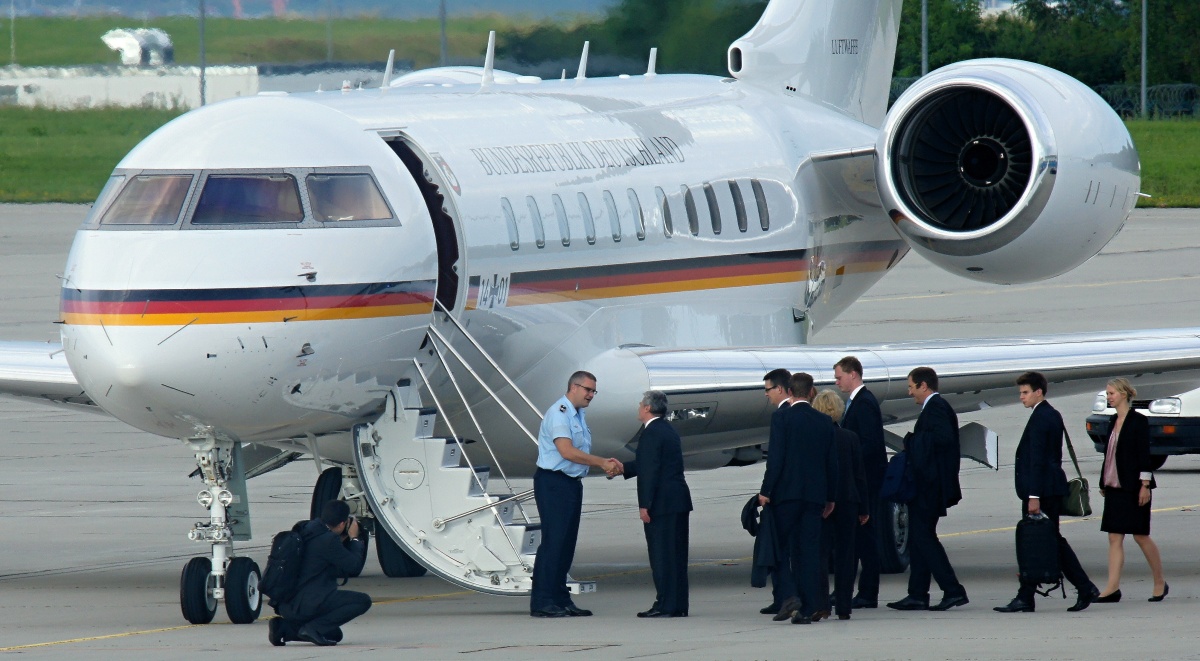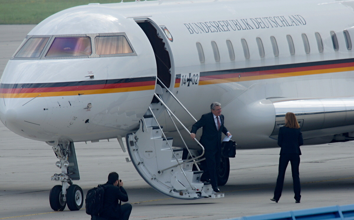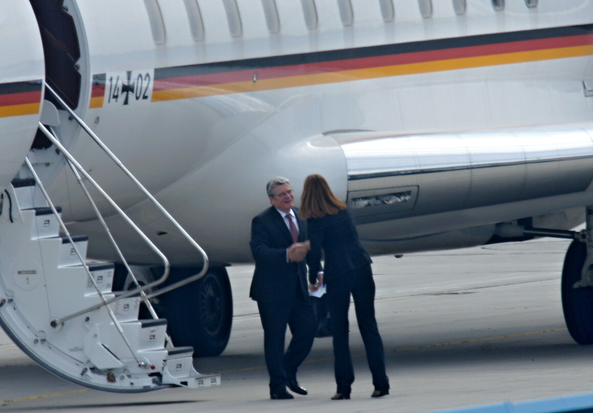 Ich dachte, Herr Gauck wäre körperlich größer...!? Neben der Delegation und v.a. dem Piloten wirkt er eher wie ein Hobbit.