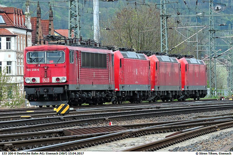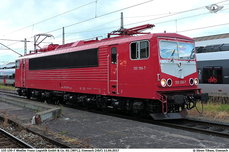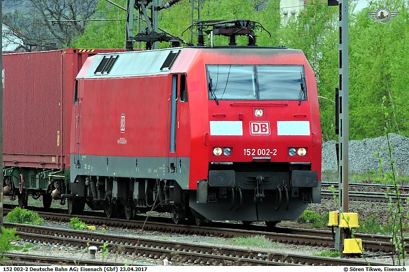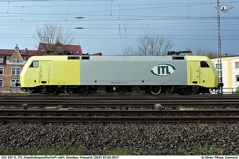 Der Lokomotivtyp ES64F von Siemens/Kraus-Maffay bzw. die DBAG Baureihe 152 wird nahezu ausschliesslich durch die DBAG betrieben. lediglich zwei Lokomotiven des Typs laufen bei der ITL. 152 197-0 stand am 07.05.2017 in Eisenach.
