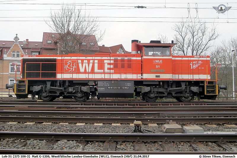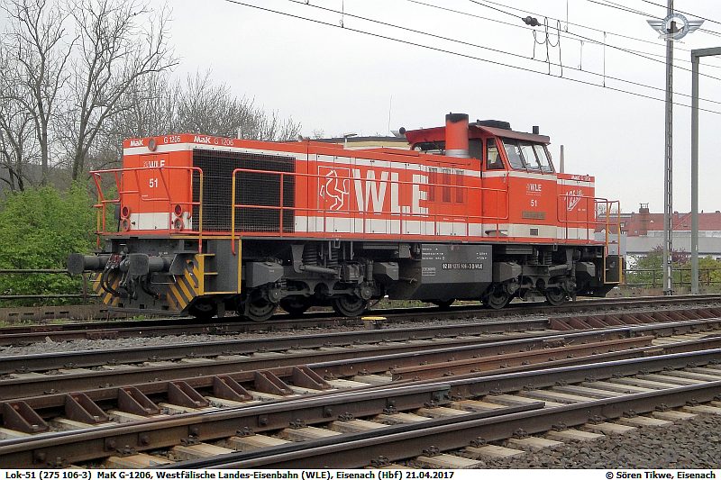 Loks des Typs MaK G1206 bzw. der Baureihe 275 sind bei uns eher selten. Lok-51 alias 275 106-3 der Westfälischen Landeseisenbahn (WLE) war am 21.04.2017 in der Abstellgruppe des Eisenacher Hauptbahnhofs abgestellt.
