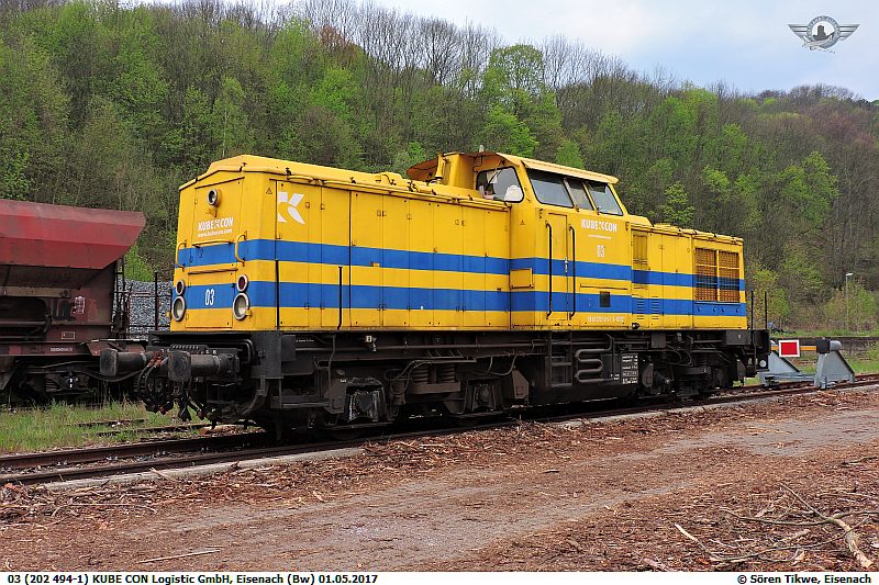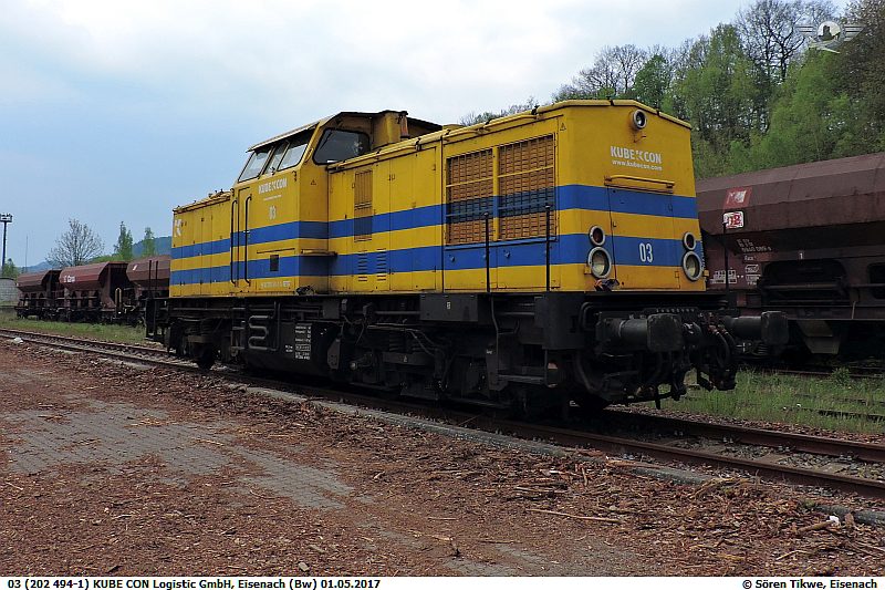 Am 01.05.2017 stand eine Lokomotive der Familie V100-Ost abgestellt. 202 494-1 gehört zur Firma Kube Con und ist dort als Lok 03 eingereiht.