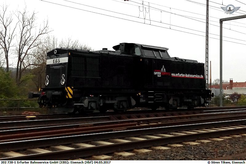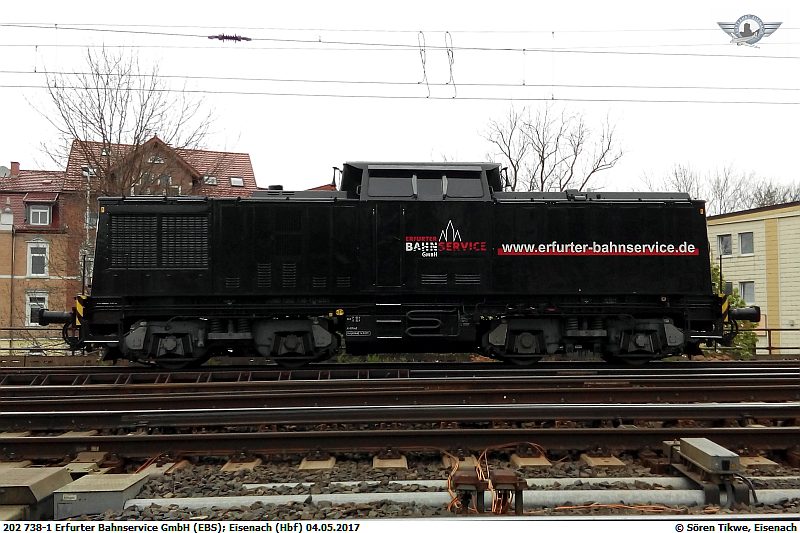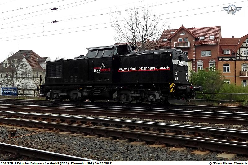 Am 04.05.2018 stand in der Abstellgruppe des Bahnhofs Eisenach die EBS mit der Ex-Adam 202 738-1, die nun auch in den Firmenfarben lackiert ist.