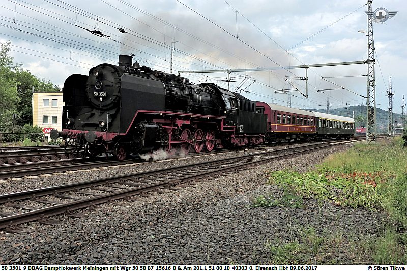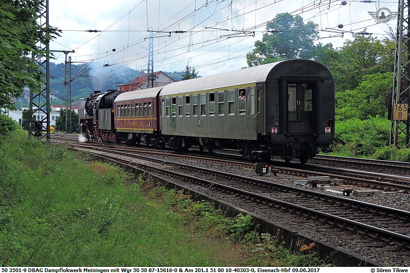 Am 09.06.2017 fuhr die Meininger 50 3501 mit zwei Reisezugwagen über Eisenach nach Fulda. In Eisenach wurde im Bw-Eisenach/Uwe Adam EVU GmbH Wasser aufgetankt. Anschliessend ging es weiter nach Fulda. Dort wurde das Aw-Fulda angesteuert, wo am 10.06.2017 der "Tag der offenen Tür" stattfand.