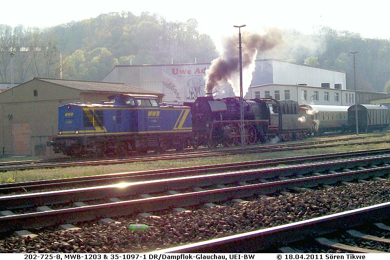 Zur anvisierten Zeit waren wir am Bahnhof. Erst mal nix. Ein anwesender Beamter der Bundespolizei "ermittelte" aber die Lage, und schickte uns zum richtigen Gleis, wo der Zug in wenigen Minuten kommen sollte. Und die Einfahrt sorgte für eine Überraschung! 35 1097-1 stand unter Dampf, hatte aber eine Zuglok des Typs V100 (DDR) vorgespannt?
