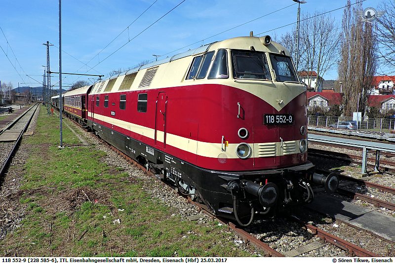 Der Star des Tages war jedoch nicht schwarz und fuhr zudem mit Diesel. 118 552-9 (228 585-6) der ITL aus Dresden zog einen Reisezug aus Löbau in die Wartburgstadt. Dabei ist die Lokomotive in mehrfacher Hinsicht interessant. Zum einen ist sie in ihren alten DR-Farben erstrahlt. Zum anderen war sie eine der beiden Regierungsloks der DDR. Und obwohl sie in den 1070 Jahren auf stärkere Motoren des Typs 12KVD 21 AL-4 mit jeweils 1200 PS umgebaut wurde, behielt sie ihre 4 Klappfenster je Seite. Und um die Sache noch zu toppen, fährt die Lok noch immer mit ihren 12 KVD Motoren aus Berlin-Johannisthal, was sich in einem dementsprechenden Klang zeigt.