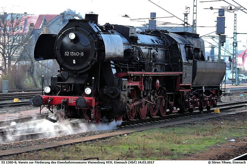 52 1360-8 gelangt bereits am 23.03.2017 nach Eisenach, wie 52 1360-8 von Neudietendorf zum Heimatort gelangt, ist unbekannt. Die Dampflokomotive wird am 24.03.2017 zwei Kies-Güterzüge befördern und dazu 2 mal zwischen Eisenach und