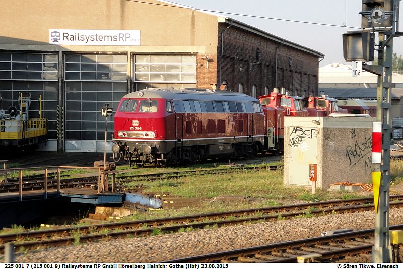 Im ehemaligen Bw-Gotha (Gehörte mal zum Bw-Eisenach) am Gothaer Hauptbahnhof habe ich diese wunderschön restauerierte Lokomotive der Baureihe 225 gesehen. Die 225 001-7 alias 215 001-9 gehört der Firma Railsystems RP aus Hörselberg-Hainich. Diese Firma hat ihre operative Basis in Gotha.