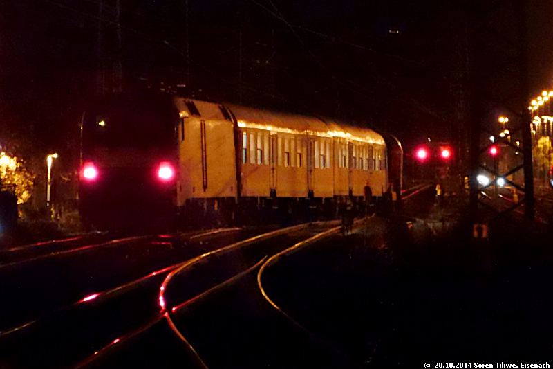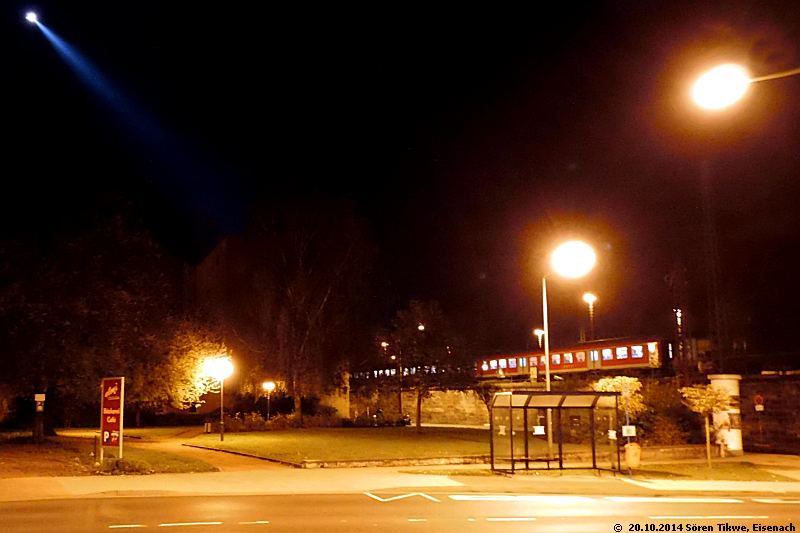 Gegen 19:20 Uhr entgleiste ein Zug der RB-20 Eisenach -->Halle bei der Ausfahrt Richtung Halle. Der Zug , bestehend aus einer E-Lok ( (MRCE ES64-U2-001/182 501-7) und 3 Reisezugwagen (Bauart Halberstadt) und einem Steuerwagen entgleiste bei der Weichenfahrt von Gleis 5 auf Gleis 4. Der Zug blockiert nun die Hauptgleise in Eisenach. Es gab keine Verletzten. Gegen 22:40 Uhr wurde ein Hubschrauber mit Suchscheinwerfer (Vermutlich Bundespolizei) hinzugezogen, der offenbar Fotos machte.