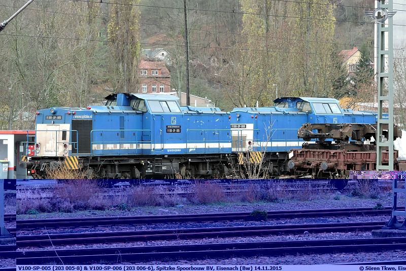 Die beiden Lokomotiven V100-SP-005 (203 005-8) & V100-SP-006 (203 006-6) der Spitzke Spoorbouw BV im Bw-Eisenach.