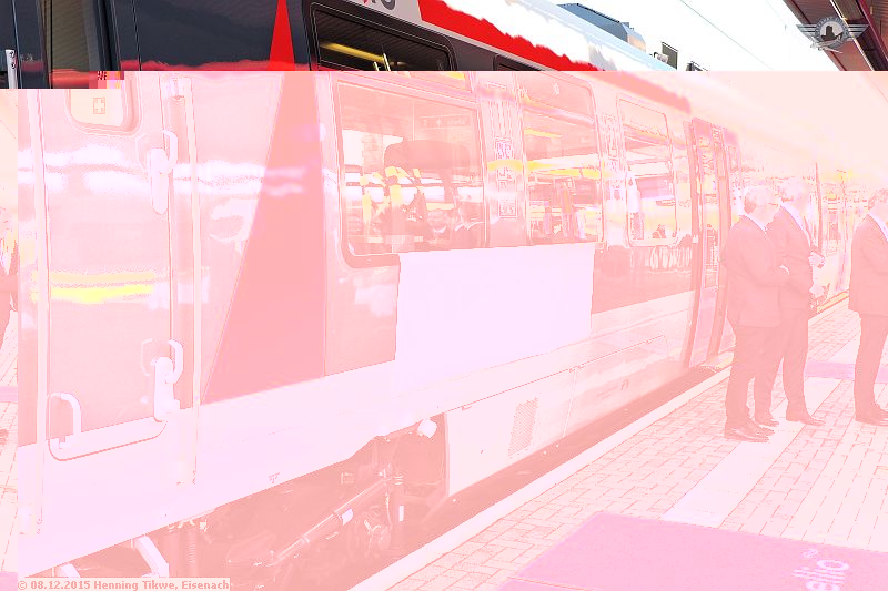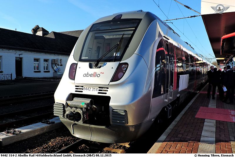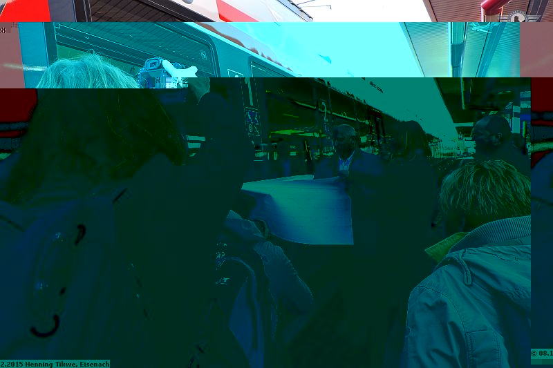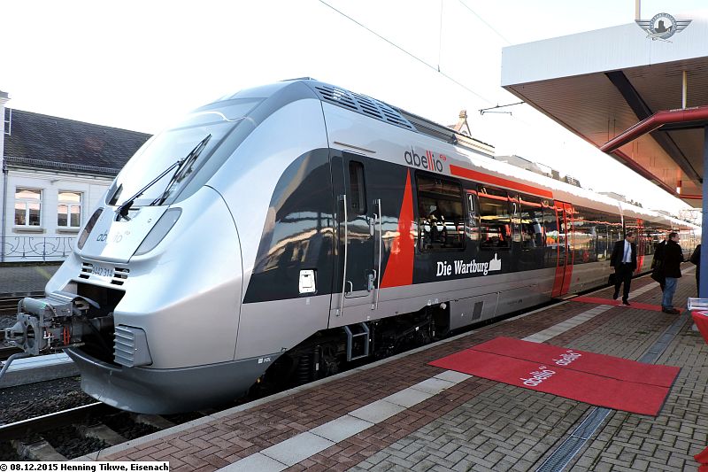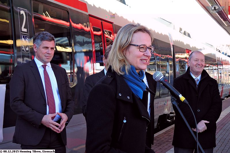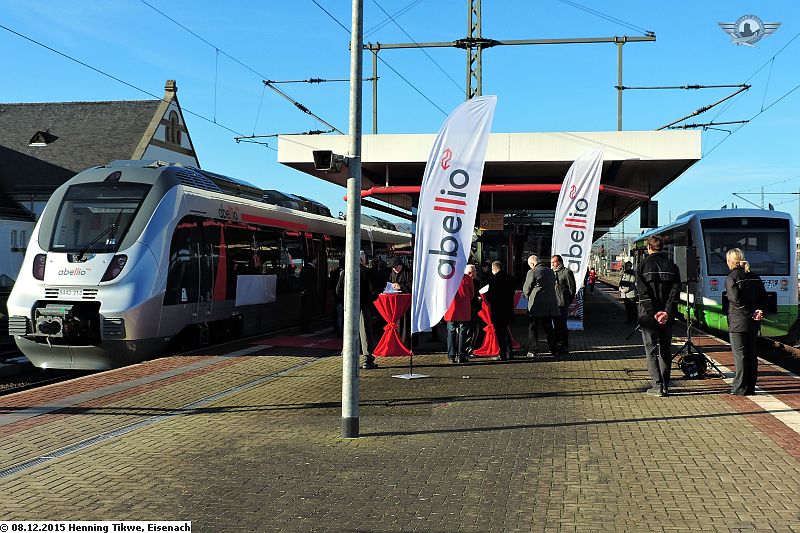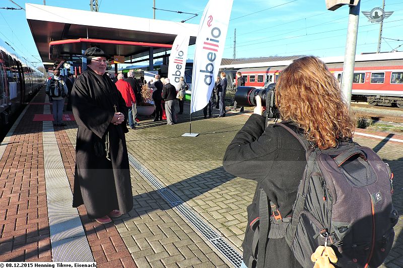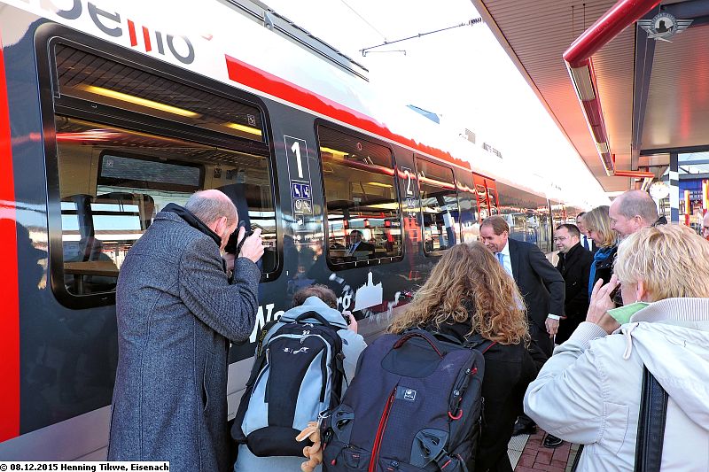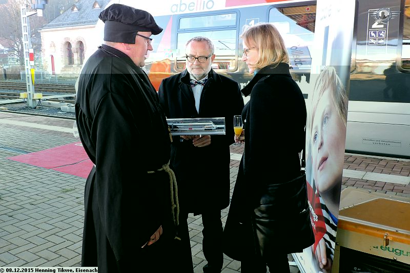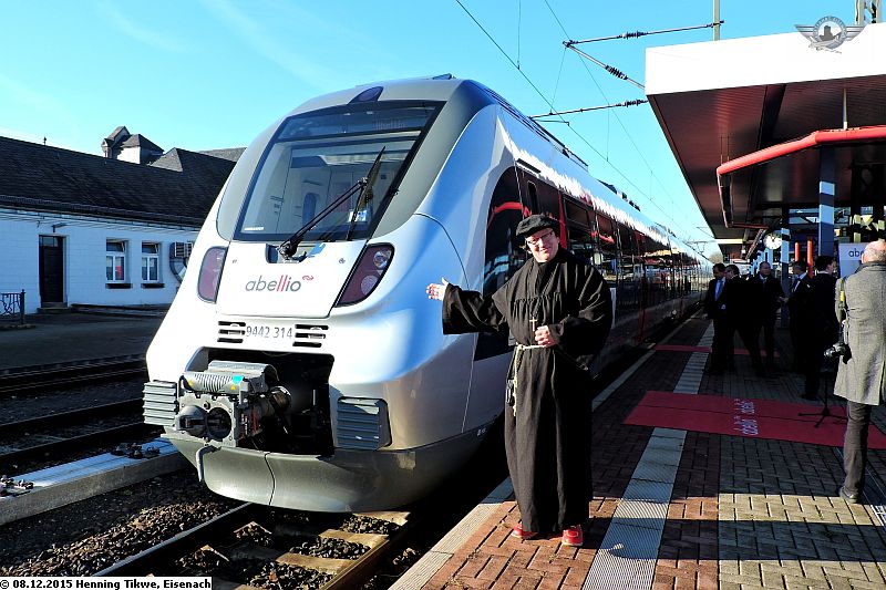 Bekanntlich übernimmt ab 13.12.2015 die Firma Abellio für die nächsten 15 Jahre den Regionalverkehr auf der Regionalbahn 20 zwischen Halle und Eisenach. Abellio ist eine Tochterfirma der Niederländischen Staatsbahn. Wie üblich auf solchen Veranstaltungen wurde natürlich nur auf das Gute hingewiesen. Das wären da auf jeden Fall der barrierefreie Einstieg, denn die Einstiegshöhe ist genau in Bahnsteighöhe. Auch die Klimaanlage ist erwähnenswert sowie der Platz für die Mitnahme von bis zu 26 Fahrrädern. Die Möglichkeit, Fahrkarten im Zug zu erwerben bestand auch schon zuvor, aber ist jetzt durch im Zug angebrachte Automaten komfortabler. Jedenfalls hat sich Frau Wolf, ihres Zeichens Oberbürgermeisterin der (noch-) kreisfreien Stadt Eisenach, nicht nehemen lassen, die Zug, ein Fahrzeug des Typs Bombadier Talent 2 mit dem Kennzeichen 9442-314, persönlich auf den Namen "Die Wartburg" zu taufen. Dazu enthüllte sie den Namenszug und besprühte diesen mit Sekt, eine Flasche dagegen zu werfen hat man sich dann doch verkniffen.