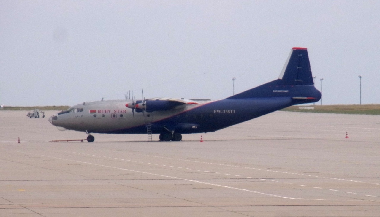 Eine Antonow 12 der weißrussischen Frachtfluggesellschaft Ruby Star, am Sa. (11. 6.) auf dem Schkeuditzer Vorfeld.