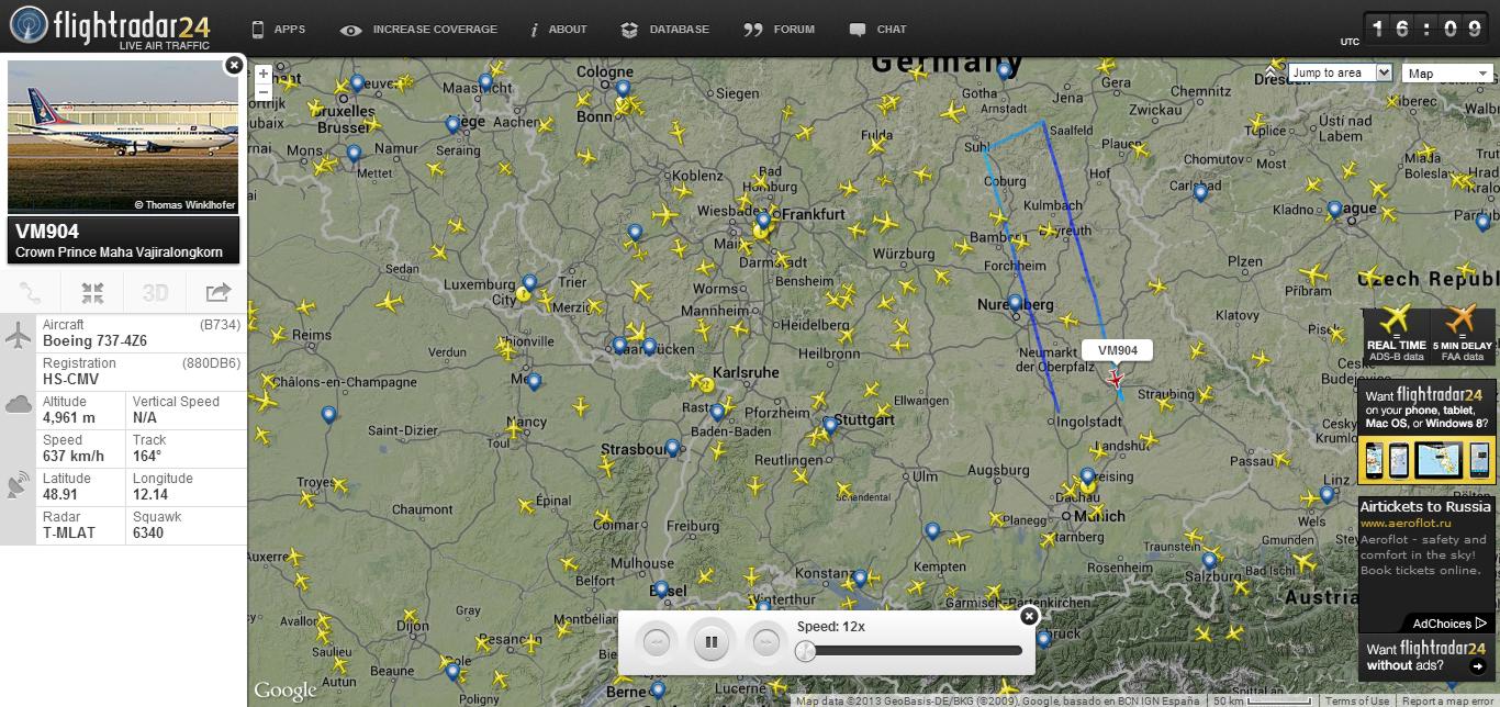 Am 26.12.2013 flog der Thailändische Kronprinz mit der Boeing 737-400 HS-CMV der Thailändischen Luftwaffe unter der Flugnummer VM-904 offenbar zum Flughafen Erfurt-Weimar. Leider ist mit unbekannt, ob auch wirklich eine Landung erfolgte, denn meine Sichtung bezieht sich auf Flightradar-24 und ist nicht eindeutig. Der Ausgangspunkt und der Endpunkt des Fluges war jeweils München.