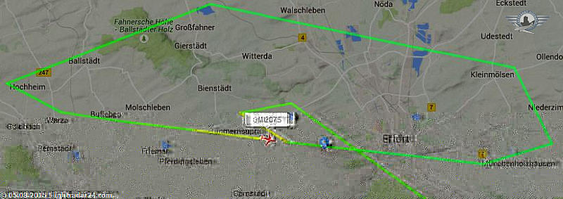 Anschliessend kurvte das Flugzeug stark nach links ein und wollte mit einer meisterhafen Kehre landen. Offensichtlich bermerkte die Piloten ihre doch recht sportliche Flugweise und starteten durch. Anschliessend wurde über der Stadt Erfurt gewendet und zunächst bis in Höhe Gotha westwärts geflogen, bis man erneut wendete und normal lndete.