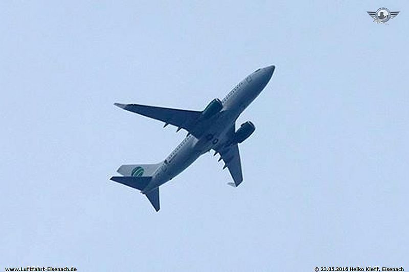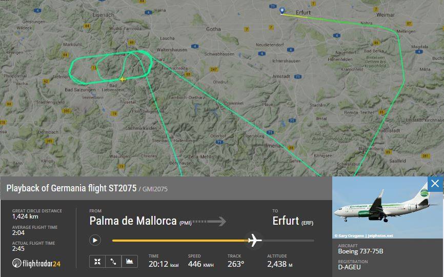 Die Passagiere vom Germaniaflug GMI2075 von Palma de Mallorca nach Erfurt-Bindersleben mussten sich am 23.05.2016 gedulden. Wegen schlechtem Wetters am Zielflughafen Ging es für die Boeing 737-75B mit dem Kennzeichen D-AGEU ins Holding südlich von Eisenach über Ruhla.