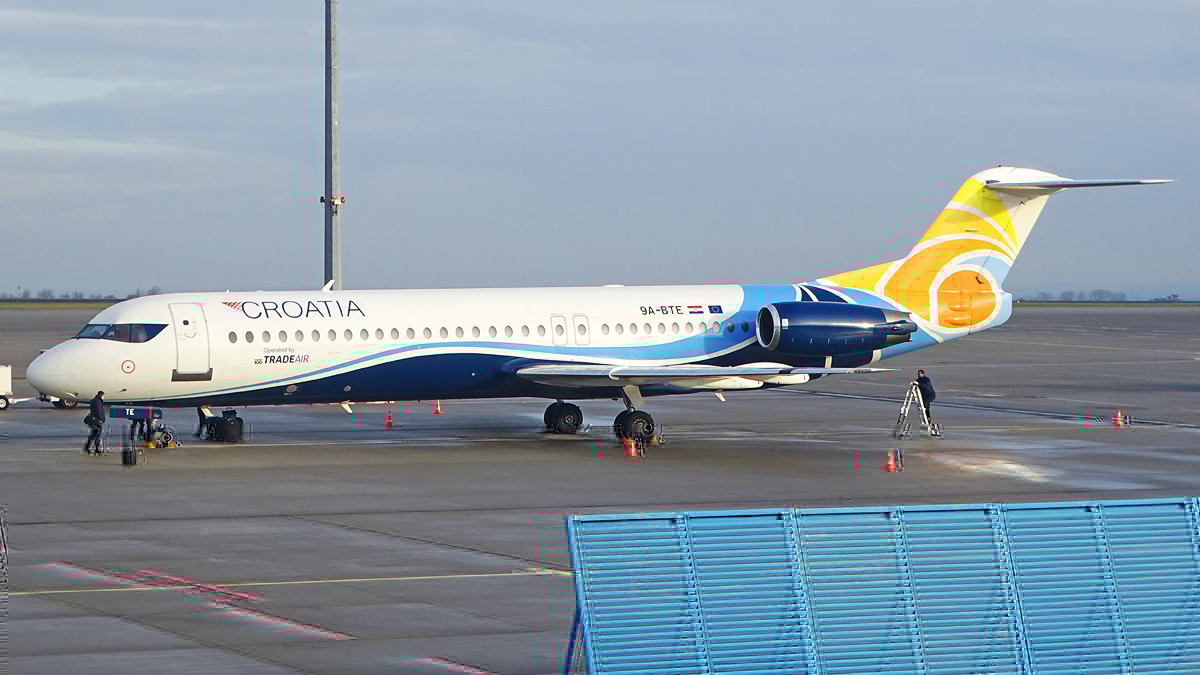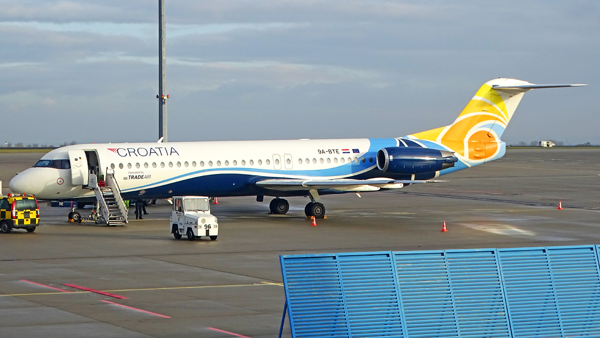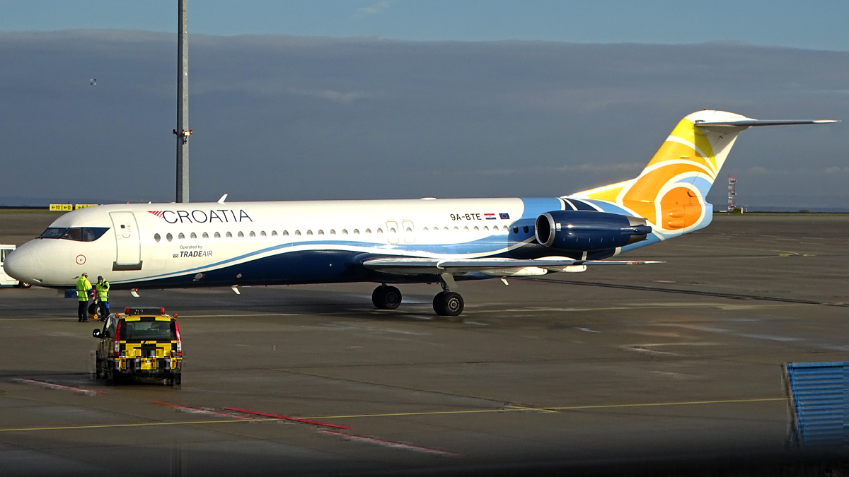 Die Fokker 100 (9A-BTE) transportierte Andre Rieu und alle zugehörigen Leute. Die Maschine kam bereits gestern aus MST und flog heute wieder zurück.