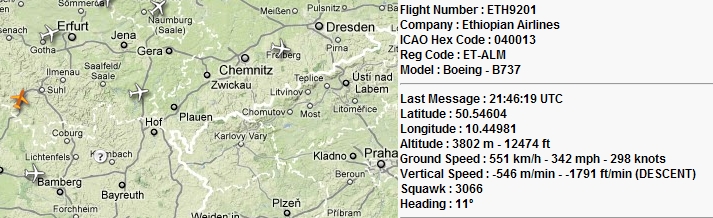 Wie man auf flightradar24 sehr gut sehen kann, ist die ET-ALM gerade auf 22.000FT über Nürnberg und wird in weniger als 20min in Erfurt eintreffen. Dann mal ein herzliches willkommen - ein aussergewoehnlicher Gast.